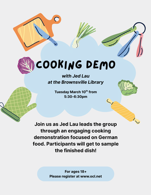 Are you interested in learning new recipes or taste-testing some delicious food?! Join us at the Brownsville Library on Tuesday March 10th from 5:30pm - 6:30pm for a fabulous cooking demonstration with the amazing Jed Lau! For this session, we will be focusing on German Food. This program is free and for adults over the age of 18. Registration is required.