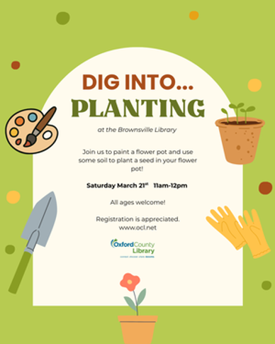 On Saturday March 21st from 11am-12pm join us to paint a flower pot and use some soil to plant a seed in your flower pot! All ages welcome. Registration is required.