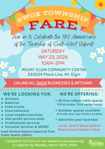 We’re looking for South-West Oxford based businesses, including: artisans, bakeries, food trucks, entertainment, local vendors/services and non-profit service clubs. All food vendors will require approval from Southwestern Public Health - proof must be provided. Showcase your product or service at our event.